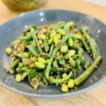 - To a large serving bowl or platter, combine edamame, scallions, and basil. Slice green beanson the diagonal into bite-sized pieces and add to bowl.