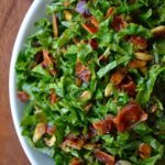 This simple kale salad with Proud Sponsor Jones Dairy Farm bacon and some parmesan is crunchy, savory, and super easy to throw together when you’re tired and aren’t sure what to make. The dressing elevates the dish and comes together easily in a blender or food processor.